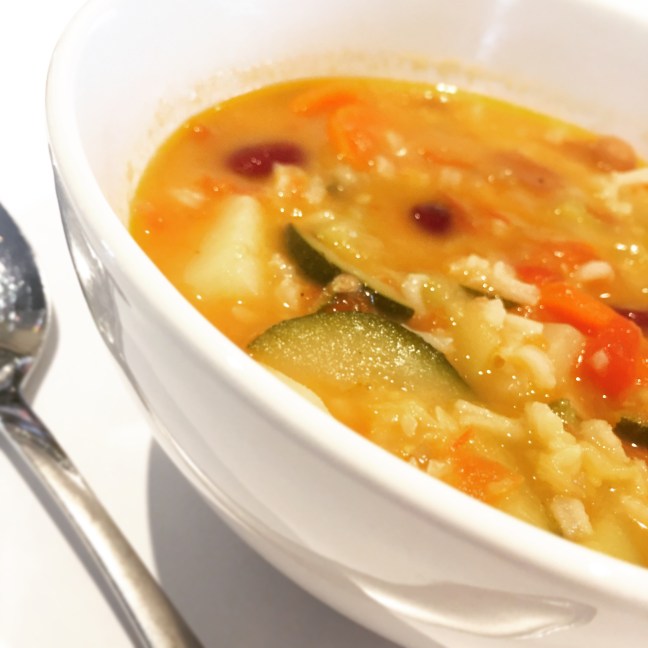 Pour revenir à notre grosse soupe, ce minestrone est ma soupe-repas favorite. En plus d’être santé, elle est délicieuse. On peut la modifier selon nos goûts mais la version ci-dessus est d’après moi la meilleure. Elle contient de tout: légumes (vitamines et minéraux), riz (glucides) et légumineuses (protéines). Personnellement, j’aime bien l’accompagner d’un morceau de fromage. Devinez ce que je mange aujourd’hui?